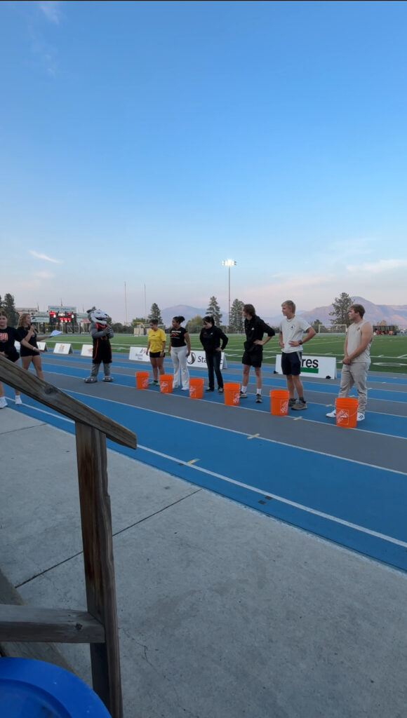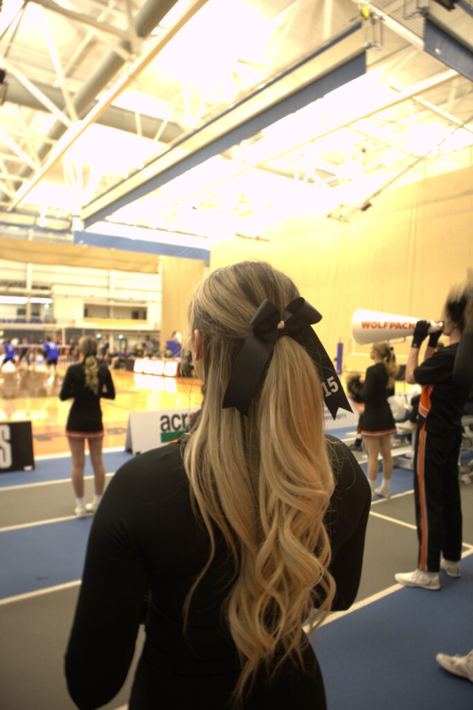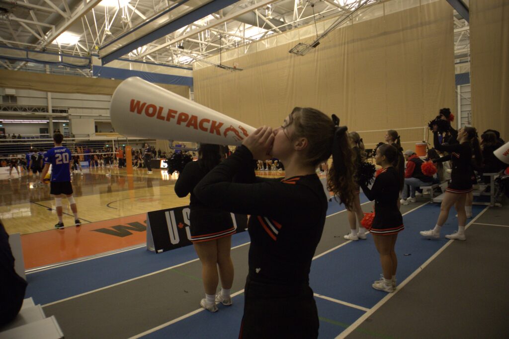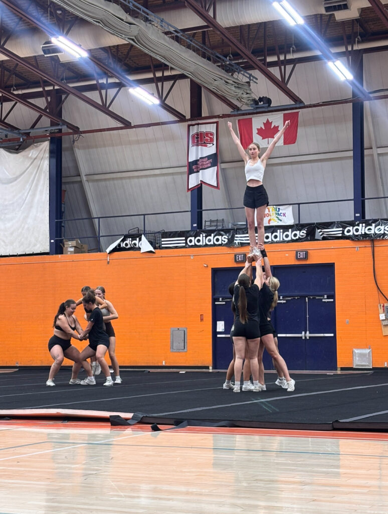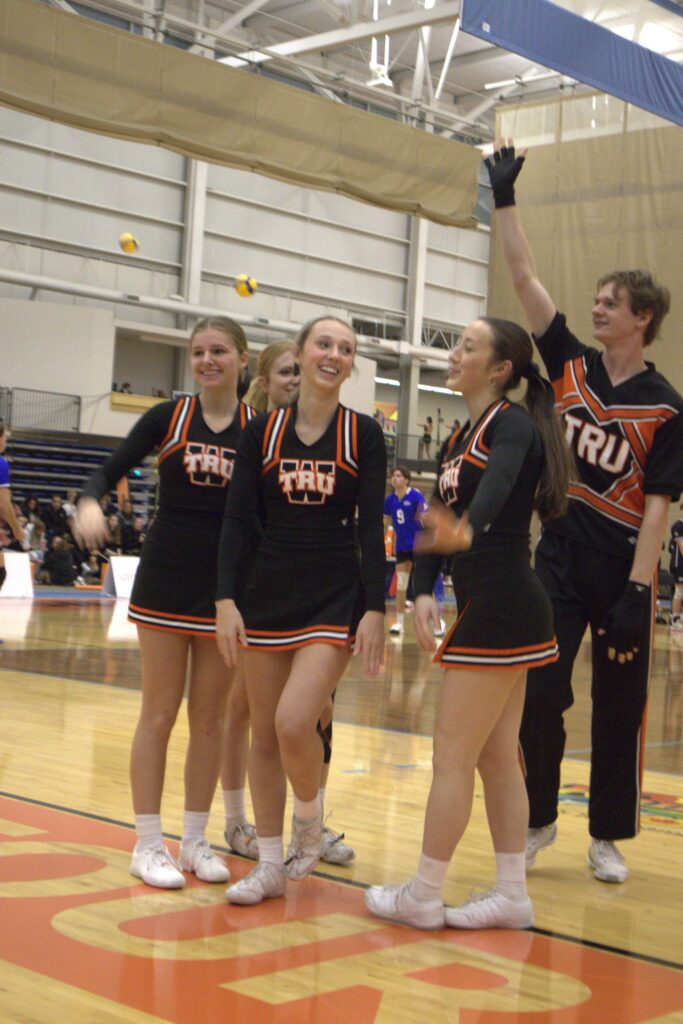 This is a photo of a couple of the cheerleaders about to start a game at halftime of a TRU Wolfpack soccer game. photo taken by me !This photo is one of the cheerleaders cheering at a TRU volleyball game. photo taken by me ! This photo is one of the cheerleaders yelling in a megaphone trying to get the crowd hyped at a game. photo taken by me ! This photo is the cheerleaders stunting. photo taken by me. This is a candid photo of the cheerleaders walking back to the sideline after performing a stunt. photo taken by me ! This is a photo from one of the cheerleaders’ late-night practices, learning new things! photo taken by me.